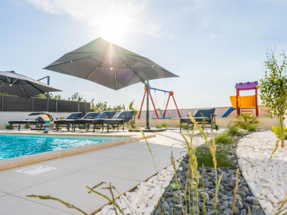 A bright open-concept living area with a fully equipped modern kitchen, dining area, and lounge. Large sliding glass doors connect the interior with the covered terrace featuring a spacious outdoor dining area and built-in barbecue. The terrace overlooks the heated swimming pool, surrounded by sun loungers and umbrellas. An outdoor shower and a separate children’s playground with a soft surface complete the outdoor amenities. This level also includes a guest toilet and a storage room.