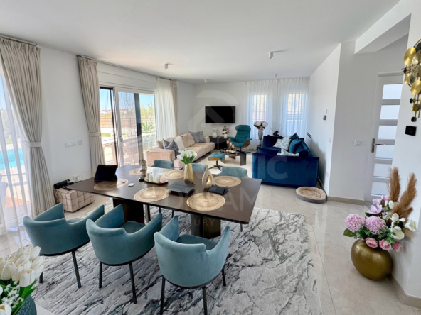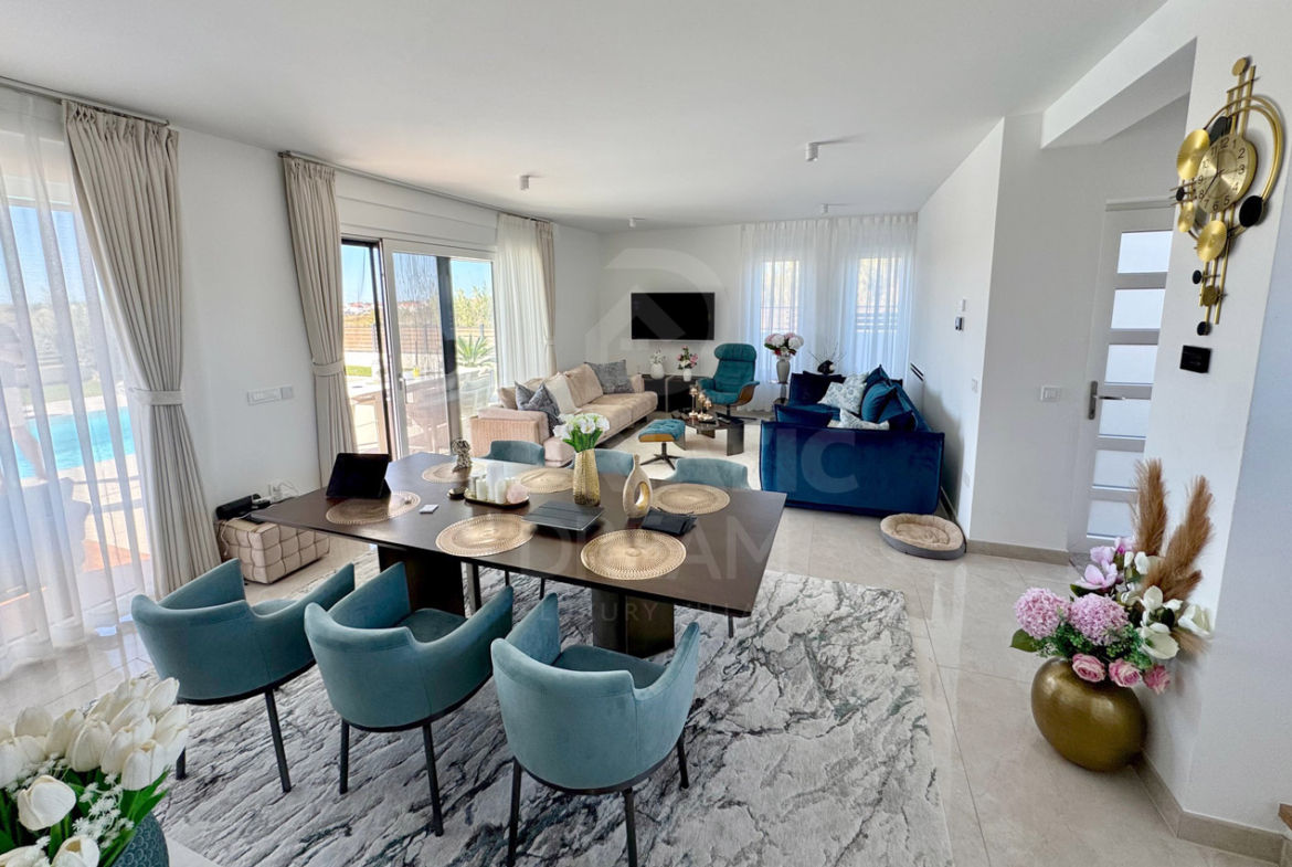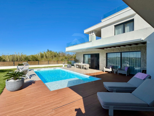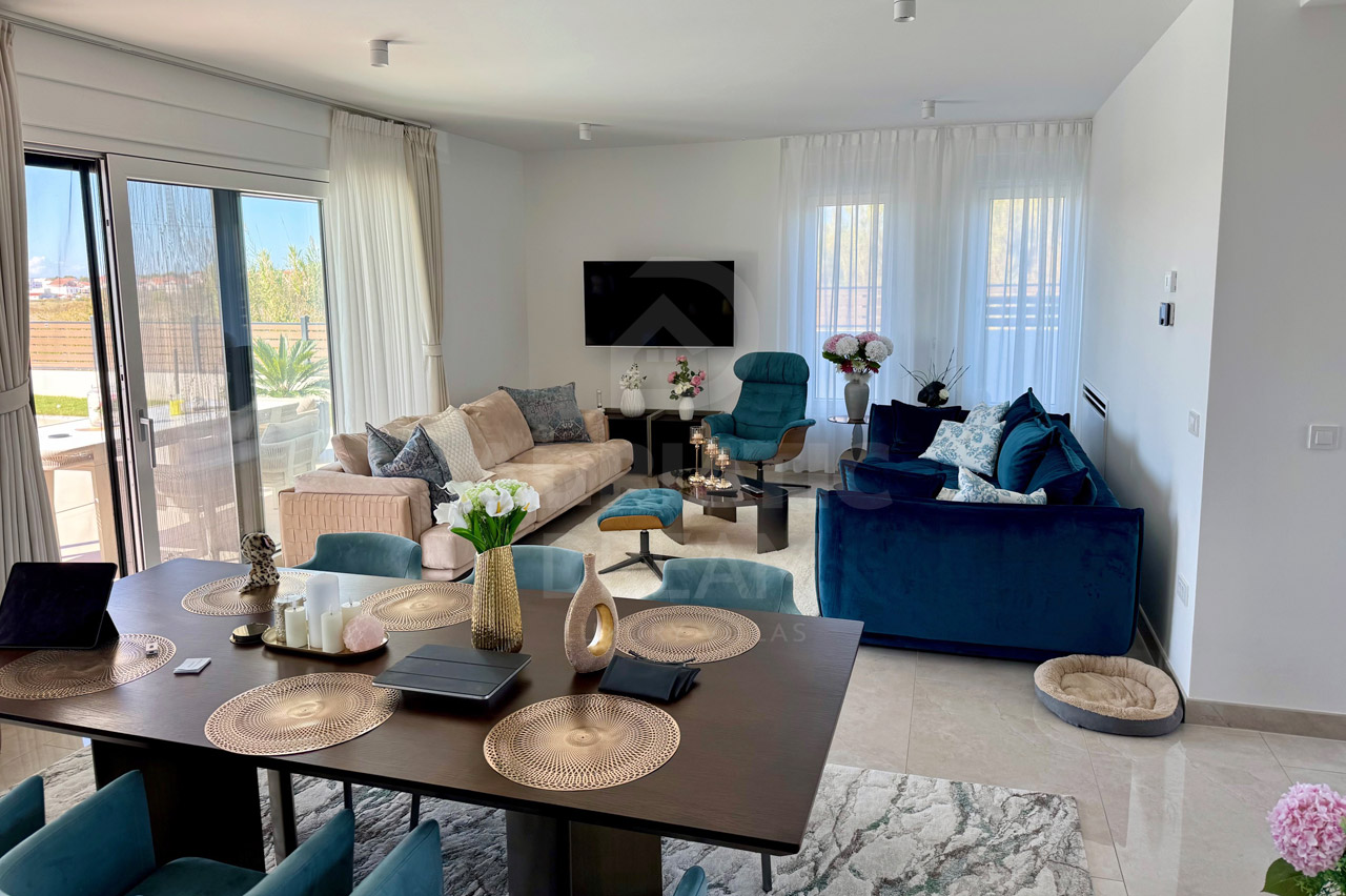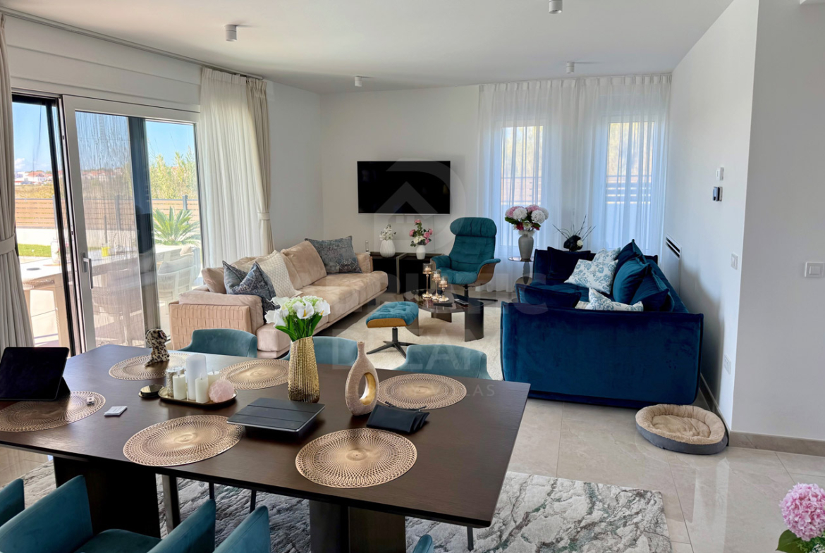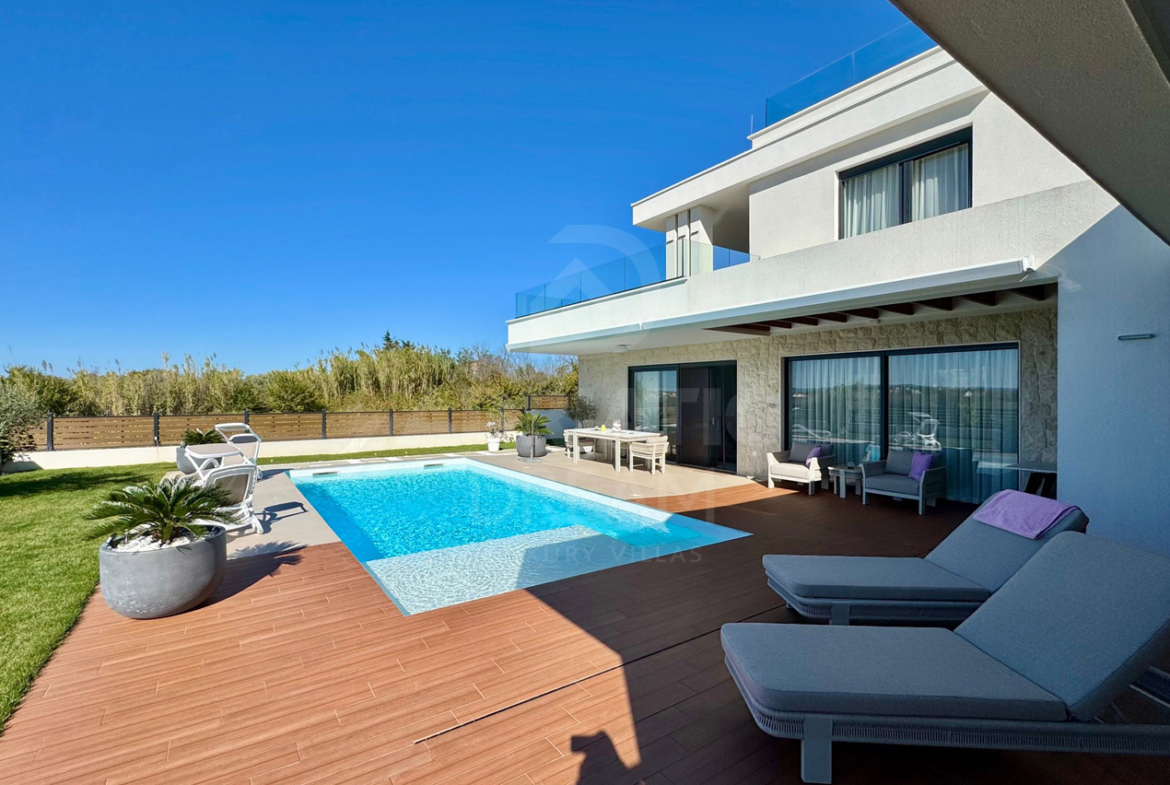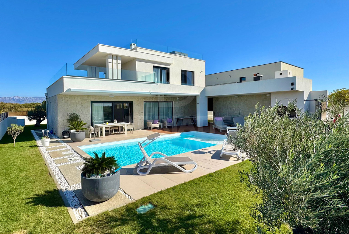 Newly built villa with pool in Privlaka near Zadar for sale. The villa is located in an excellent secluded location. Apart from the neighboring house on the eastern side, there are no other houses nearby because the neighboring land is not intended for construction. Privacy and peace are guaranteed. The villa has a sea view. Roof terrace with a full view of the sea and the mountain. Heated pool 38m2 (8.5m x 4.5m) with automatic water quality regulation, salt water by salt electrolysis. Heating of the villa and water via a heat pump – air and water and underfloor heating in all rooms. 7-chamber windows with roller shutters with electric motor. The facade of the ground floor is made of natural stone. Outdoor summer kitchen with chimney – wood-burning grill. Automatic irrigation of the garden. Automatic entrance door to the yard. Roof terrace 40 m2. The total gross area of the villa with terraces is 244 m2. Three parking spaces with electric vehicle chargers. The terrain is equipped with all utilities, asphalted road. Good access from the main road, lighting.